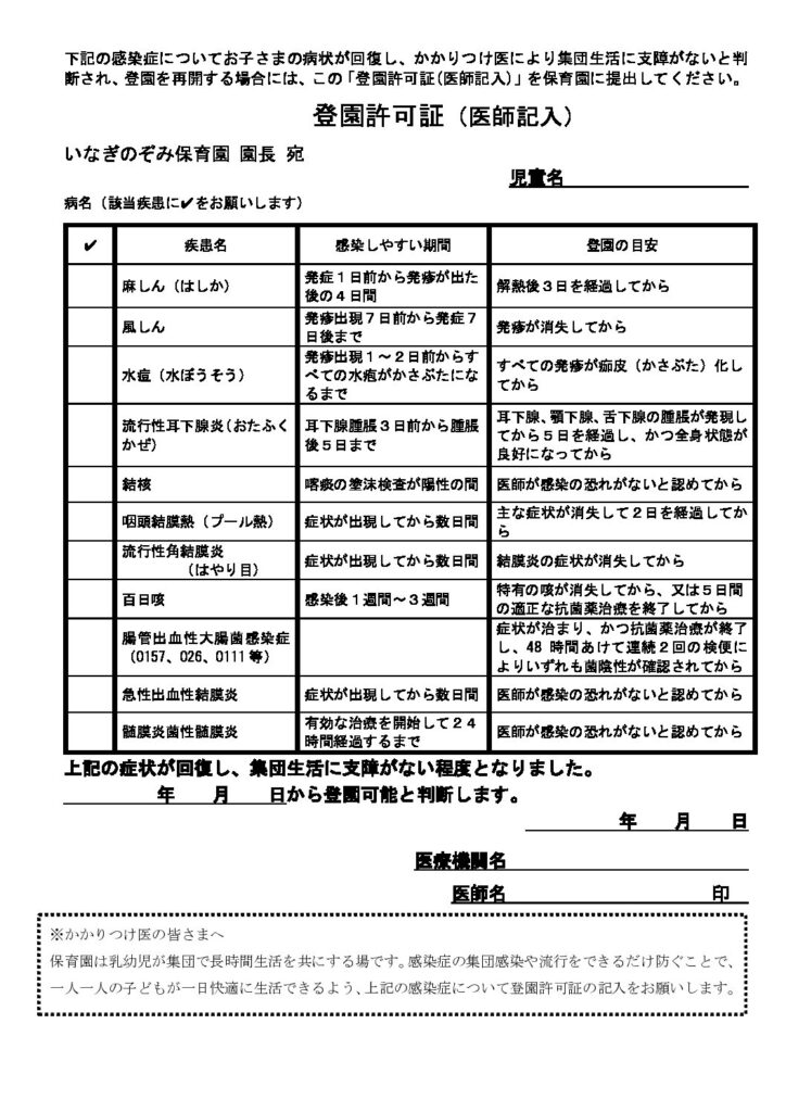 登園届(ダウンロードはこちら) 投稿日 2021年11月22日 更新日 2025年11月19日 著者 いなぎのぞみ 保育園 カテゴリー 各種書類 登園許可証(医師記入)こちらをお使いください ※ダウンロード無効